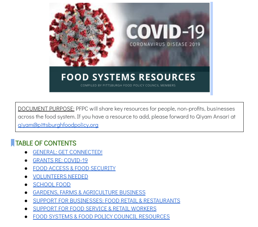 匹兹堡食物政策委员会还创建了一个食物体系资源文档并向所有人共享,人们可以实时查看有哪些开放的农夫市集以及其他食物来源,食品企业及工作者也都能从中找到有用的信息,想提供资助或者志愿服务的人们则可以在这里找到途径。